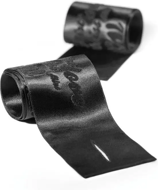 Satijnen handcuffs met tekst, om je geliefde zacht mee te boeien.