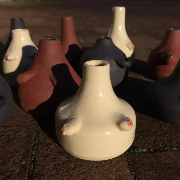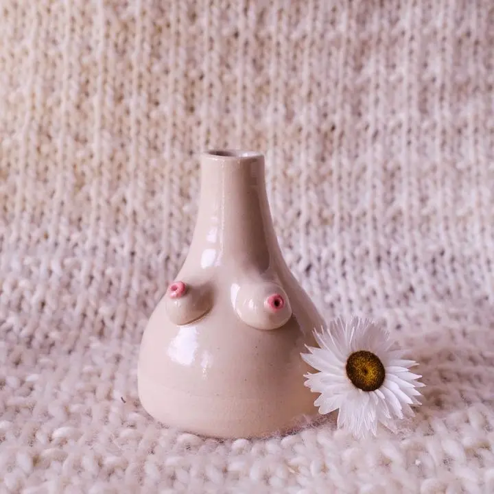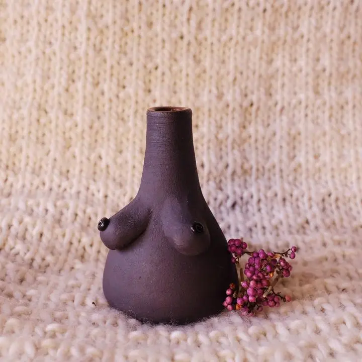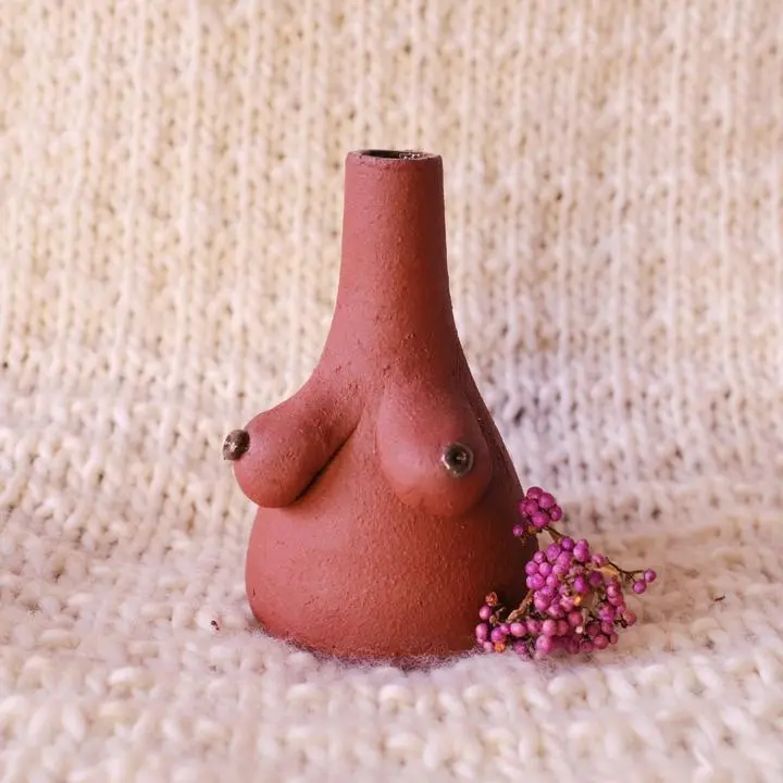 Handgemaakt vaasje van aardewerk met vrolijke boobs. De donkere en de rode vaasjes zijn ongeglazuurd. Ze hebben een mooi aards uiterlijk en lief met allemaal verschillende borstjes. Het beige vaasje is geglazuurd.