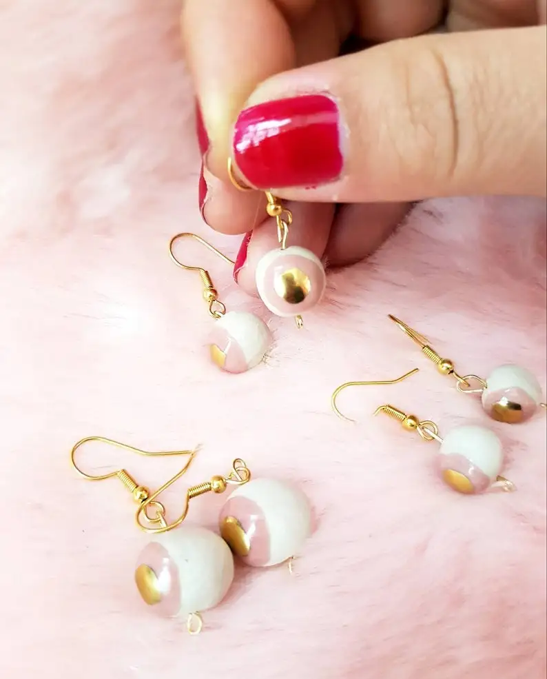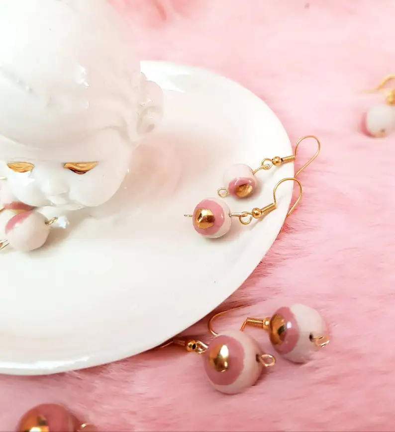 Zoete Boobie oorbellen, van porselein met een roze tepelhof en een goudluster tepeltje.