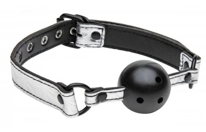 Je sub sexy sprakeloos maken met het comfort van kunnen blijven mond-ademen. Dat is het doel van deze gag. De band is zacht gevoerd, van neopreen, met een gewatteerde glanzende zilver buitkant.