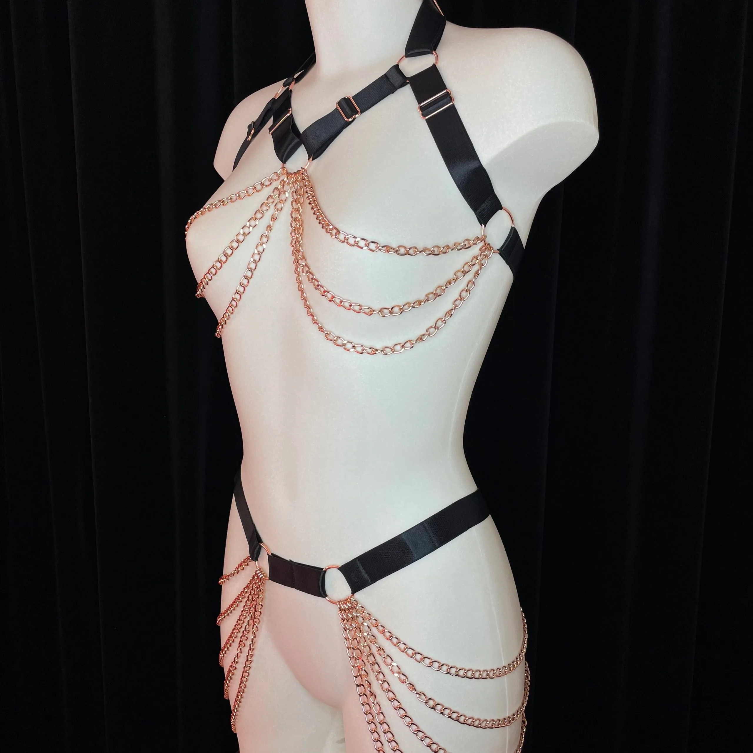 Heel leuke accessoire voor boven of onder je feesttop. De elastische straps zijn in alle standen verstelbaar; de kettingen zijn van lichtgewicht metaal.