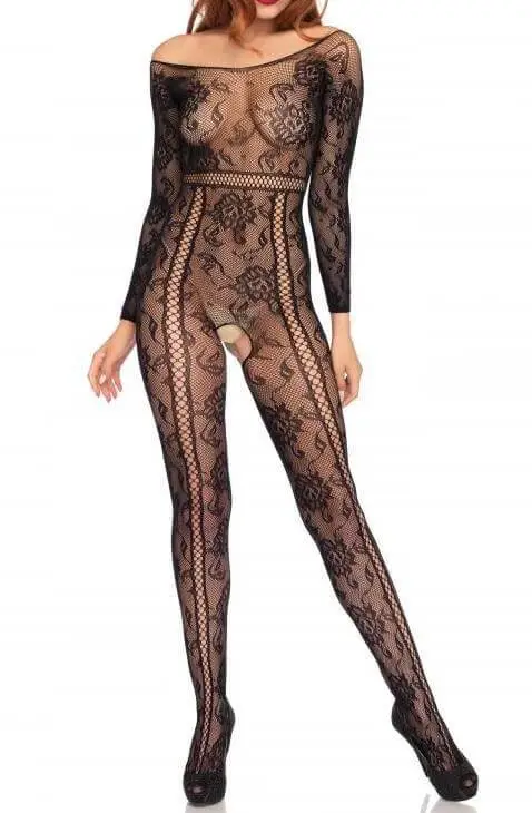 Mooie bodystocking van nylon met spandex van kant met een bloemenpatroon, hij heeft aan de voorkant en in de taille stroken van visnet. Met een open kruisje. Hartstikke sexy!
