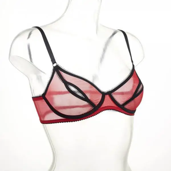 Onze Slitt Bra, met de speelse spleetjes, nu ook in rood gaas. Sierlijk in zwart afgebiesd. Een van onze meest succesvolle klassieke modellen met de perfecte pasvorm! Je kan de split iets gesloten houden maar de fun zit in de opening waardoor je tepels piepen. De wrijving van je tepels onder je kleding voelt zeer erotiserend.