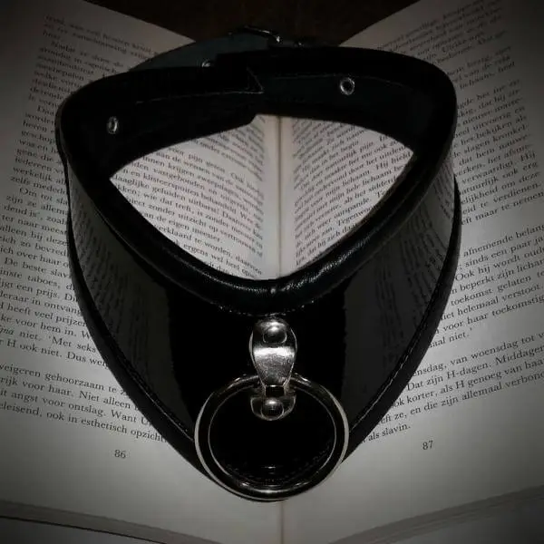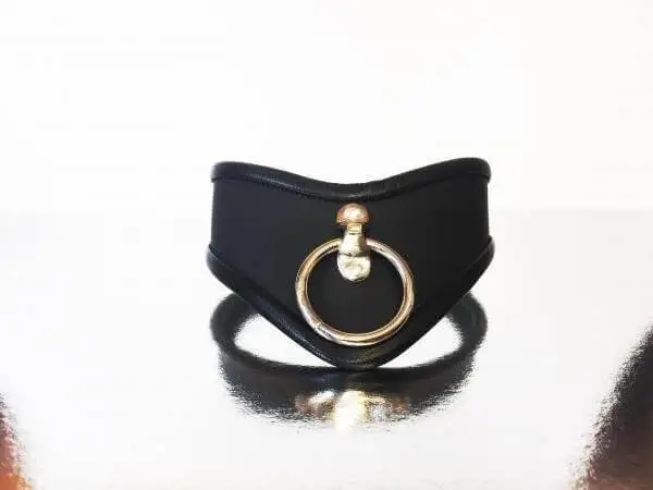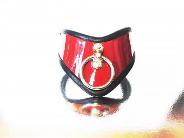 Fraai gevormde hoge halsband van kwaliteitsleer met een zacht leren voering. Met een grote ring. We hebben deze collar in mat zwart, zwarte lak of rode lak.