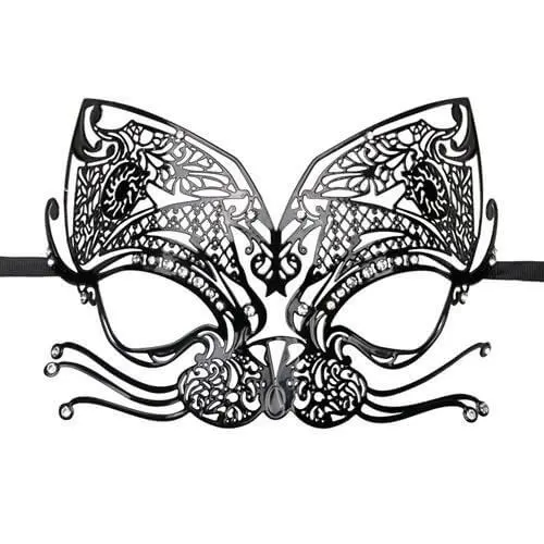 Masker van metaal, versierd met glimmende steentjes. Het masker sluit met satijnen lint.