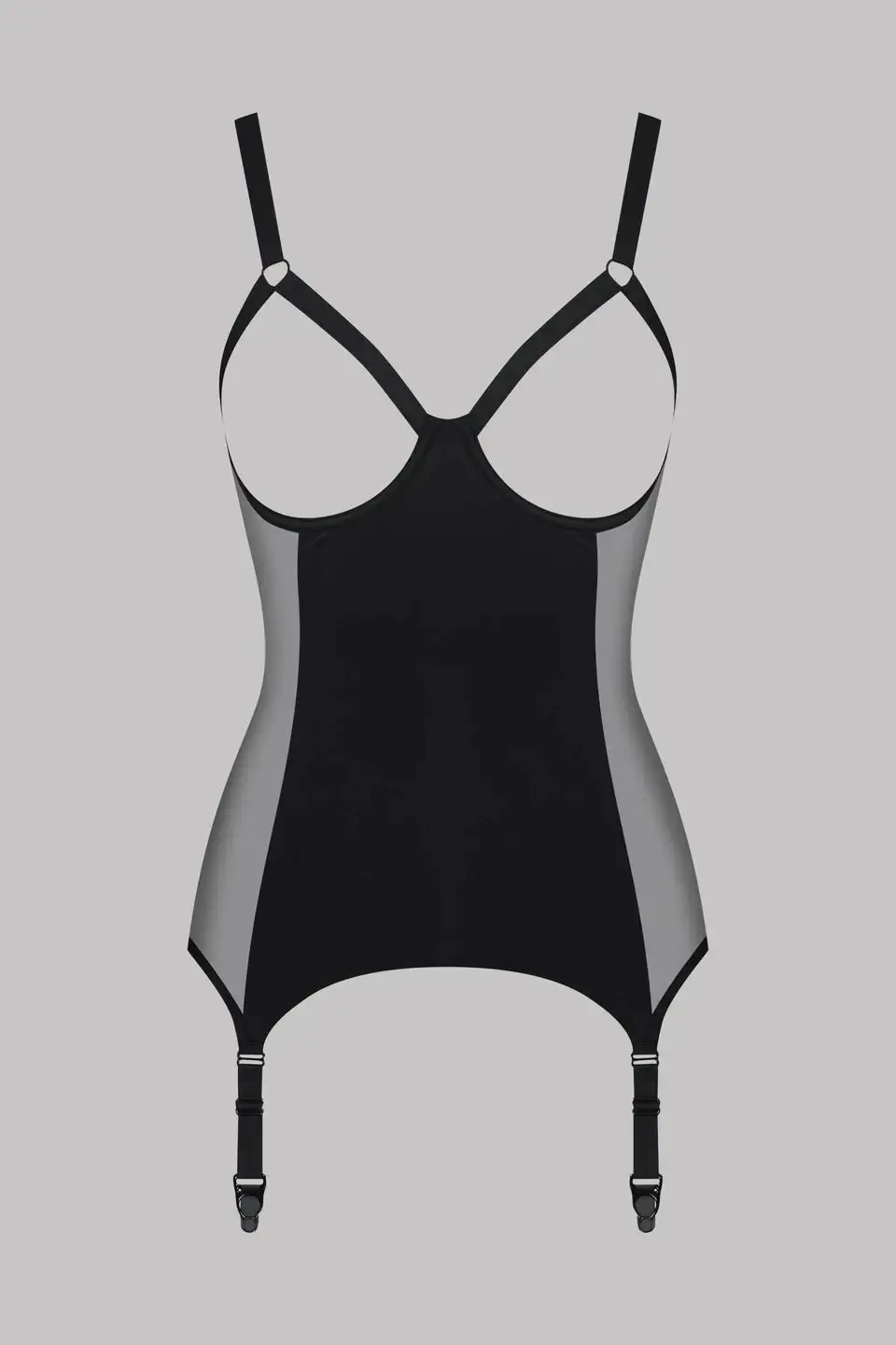 Mooie bodystocking met open cup en transparante zijkanten. Deze zachte, gladde bodystocking zal je borsten mooi omlijsten. De body is gemaakt van zachte microfiber, heeft transparante zijkanten en is zeer rekbaar. Met jarretels voor je kousen.