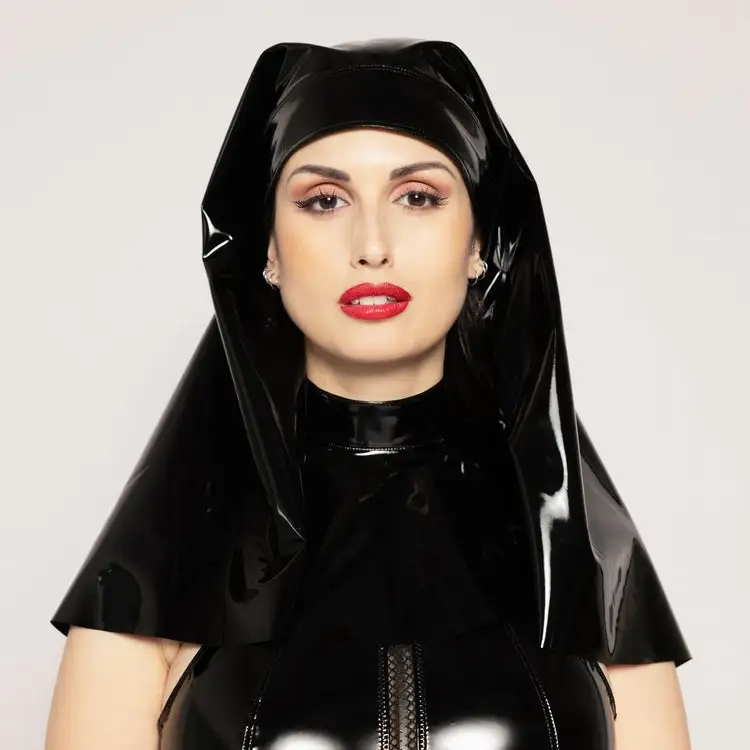 Nonnenhoofdtooi van vinyl lak, passend bij de kraag en de Boréal-jurk.
