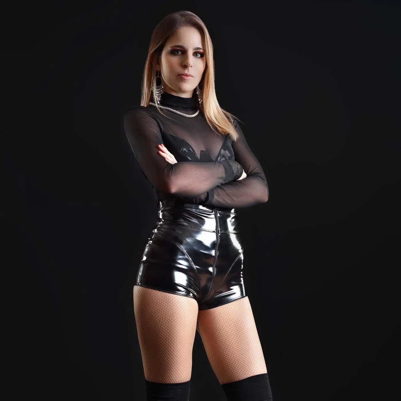 Getailleerde short van vinyl. De snit en uitsnijdingen accentueren je benen en billen. Spannend detail is de rits die je vanaf de taille voor, tot het midden van de billen, kunt openen. Met de twee schuifregelaars kun je leuk met de openingen spelen.