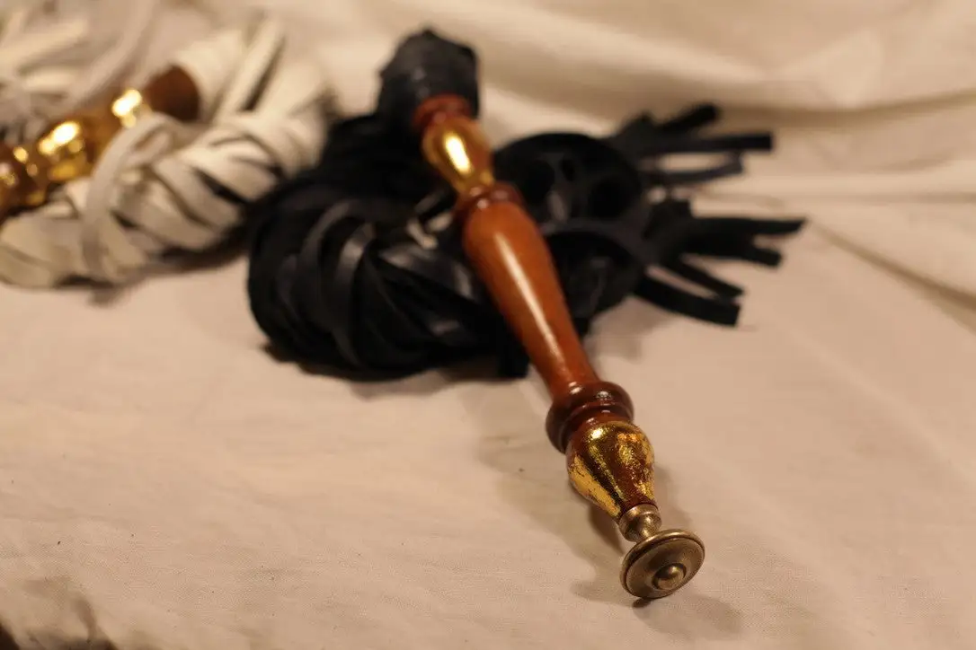 Ramzart maakt duurzame floggers van gerecycled materiaal. Dat is zowel van kleding, alsook van interieurstukken. De leren strengen zijn royaal en voelen luxueus zacht. Het houten handvat ligt lekker in de hand, en krijgt door de curves meteen een goede grip. Luxe detail is dat de afwerking aan bovenkant met de koperen knop. Boudoir fähig wordt de flogger totaal door de afwerking met bladgoud!