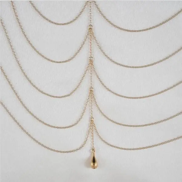 Een draperie van gouden kettingen die je bovenlichaam decoreren. Beeld je het gevoel in van het aaien en zwaaien van de kettingen over je blote borsten… Dit is een in alle opzichten wellustig bodysieraad waar drager en toeschouwer zeker genot aan beleven. Mooi en speels detail vormt de gouden druppel.
